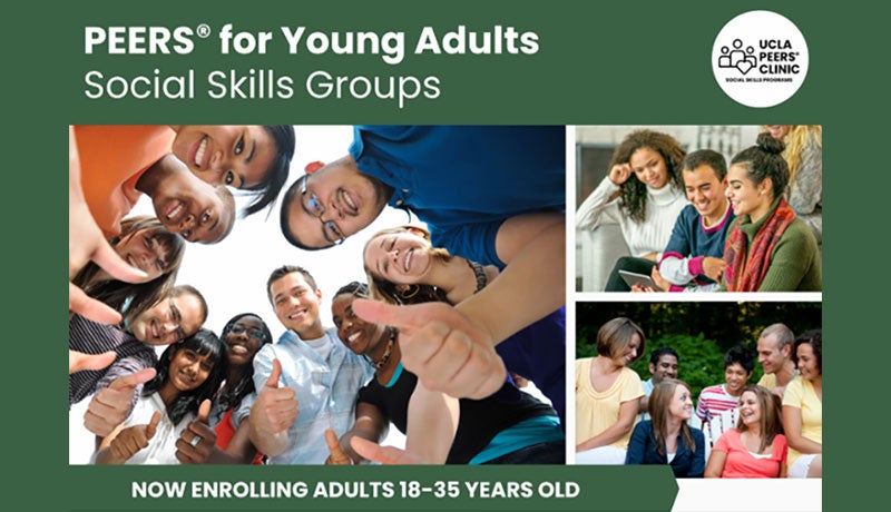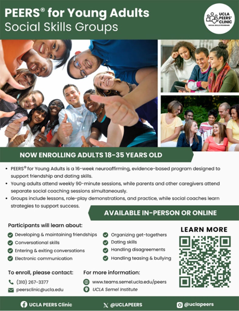 The PEERS® for Young Adults Social Skills Groups are currently enrolling adults 18-35 to participate in sessions online and in person. Learn more at www.teams.ucla.edu/peers