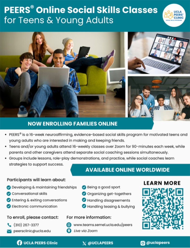 The PEERS® Online Social Skills Classes for Teens & Young Adults are currently enrolling families to participate in online sessions. Learn more at www.teams.ucla.edu/peers